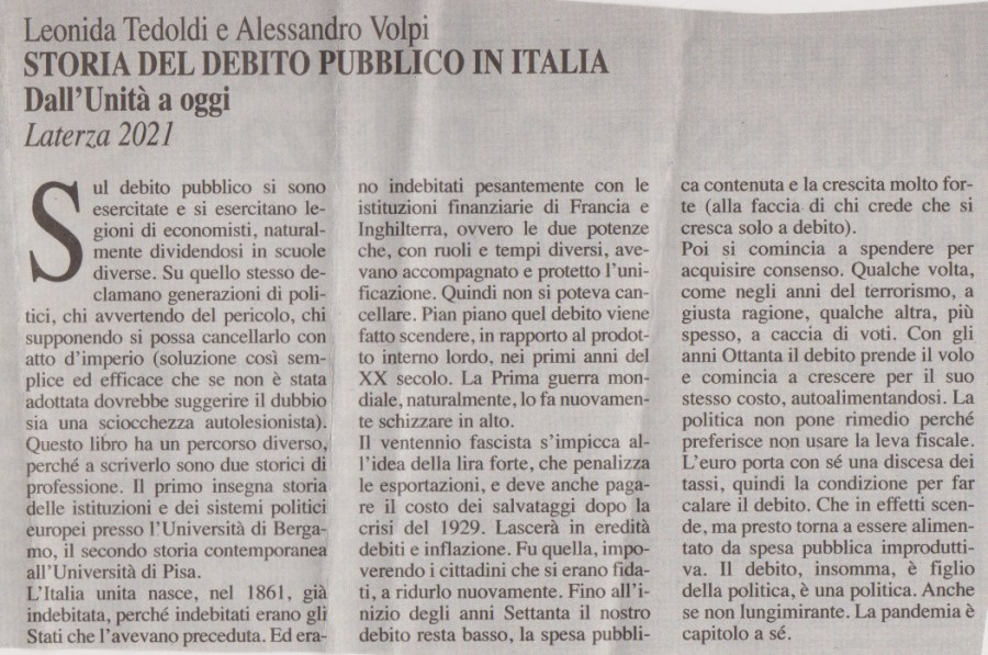 in Letture.org: «Prof. Alessandro Volpi, […] il debito pubblico italiano ammonta attualmente a oltre 2.600 miliardi di euro, una cifra spropositata: come ha potuto crescere così tanto? “Nella storia italiana il debito pubblico, a più riprese, è servito a finanziare la spesa pubblica nei momenti in cui è cresciuta molto evitando di ricorrere alla leva fiscale. In altre parole, i governi che si sono succeduti, già dagli anni della Destra storica, fino all’età giolittiana e poi durante il fascismo e nel dopoguerra repubblicano, hanno preferito fare ricorso al debito piuttosto che varare vere e proprie riforme del sistema fiscale o limitare la spesa, sia quella per gli investimenti sia quella corrente. Non è certo un caso in tal senso che il mercato finanziario italiano sia nato con l’obiettivo primario di trovare compratori dei fondamentali titoli del debito pubblico”. Quando nasce il debito pubblico italiano? “Il debito nasce già nel 1861, all’indomani dell’Unità d’Italia, quando il neonato Regno deve riconoscere i debiti degli Stati preunitari. Si tratta di una scelta “obbligata” perché tali debiti erano stati contratti in larga prevalenza con le grandi banche francesi e inglesi, legate a Napoleone III e alla politica britannica che erano state decisive nel sostenere il Regno di Sardegna di Cavour e Vittorio Emanuele II contro gli Asburgo. Inoltre, era evidente da subito che lo Stato italiano avrebbe avuto bisogno di fare ulteriore debito, e dunque se non avesse riconosciuto i debiti pregressi non avrebbe più trovato chi fosse disposto a finanziarlo”. Di chi sono le responsabilità di una tale crescita? “Le responsabilità sono molteplici, perché, come accennato, la scelta di ricorrere al debito fu largamente condivisa dalle diverse classi dirigenti che si sono succedute alla guida del Paese. Certo, in alcuni momenti il ricorso al debito è stato maggiore; in particolare durante i conflitti, per sostenere la spesa bellica, e poi a partire dall’inizio degli anni Ottanta, quando dell’utilizzo dell’indebitamento si è largamente abusato, senza tener conto del rapido aumento del costo degli interessi determinato dalla liberalizzazione dei flussi di capitale. Se, infatti, fino agli anni Ottanta, con i vincoli allo spostamento dei capitali e con la possibilità per la Banca d’Italia di comprare i titoli del debito pubblico, i tassi di interesse da pagare per il loro collocamento erano molto bassi, dopo il famoso ‘divorzio’ fra Banca d’Italia e Tesoro e, soprattutto, dopo la piena libertà di circolazione dei capitali, tali tassi sono rapidamente schizzati a due cifre, per fare concorrenza ai titoli del Tesoro degli Stati Uniti. Da allora fino all’arrivo dell’euro, il costo del debito secondario, degli interessi, ha fatto esplodere il debito portandolo sopra il 100% del Pil”» (leggi qui).