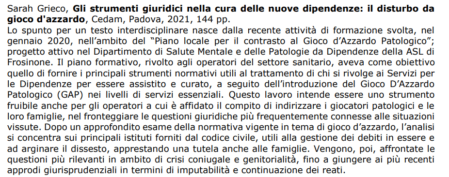 Grieco Sarah, Gli strumenti giuridici nella cura delle nuove dipendenze: il disturbo da gioco d’azzardo, Cedam, 2021