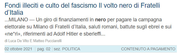 … Un giro di finanziamenti in nero per pagare la campagna elettorale su Milano di Fratelli ditalia, saluti romani, battute sugli ebrei e sui “ne*ri”, riferimenti a Hitler e sberleffi verso Paolo Berizzi, il giornalista di Repubblica sotto scorta per le minacce ricevute dai neofascisti. La prima puntata di un’inchiesta video di Fanpage , andata in onda anche su Piazzapulita, coinvolge il partito di Giorgia Meloni e direttamente uno dei suoi esponenti più in vista, l’europarlamentare Carlo Fidanza, colui che, a un cronista sotto copertura, propone di pagare “in black” alcune spese di una candidata. L’uomo che fa da collegamento tra FdI e la destra più nostalgica nel capoluogo lombardo è Roberto Jonghi Lavarini, alias il “Barone nero”, soprannome ripreso da Julius Evola. Una vicenda che mette in grande imbarazzo quello che è – secondo i sondaggi – il primo partito italiano. Fidanza ha annunciato di essersi autosospeso da Fdi. Mentre Giorgia Meloni assicura che “nel nostro movimento non c’è spazio per atteggiamenti ambigui sull’antisemitismo e sul razzismo, per il paranazismo da operetta o per rapporti con ambienti dai quali siamo distanti anni luce, né per atteggiamenti opachi sul piano dell’onestà”. Però prima di prendere decisione chiede a Fanpage l’intero girato dell’inchiesta, cioè 100 ore di filmato. Pd e M5s: fatti gravi. ….