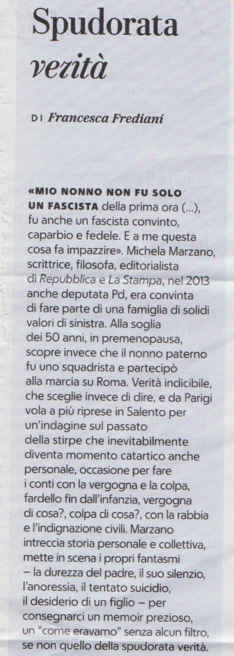 Michela Marzano intreccia il passato familiare alle pagine più controverse della storia del nostro Paese. Michela non sapeva. Per tutta la vita si è impegnata a stare dalla parte giusta: i fascisti erano gli altri, quelli contro cui lottare. Finché un giorno scopre il passato del nonno, fascista convinto della prima ora. Perché nessuno le ha mai detto la verità? Era un segreto di cui vergognarsi oppure un pezzo di storia inconsciamente cancellato? “Sono stata pure io complice di questa amnesia?” si chiede Michela dopo aver ritrovato una vecchia teca piena di tessere e medaglie del Ventennio. Inseguendo il filo teso attraverso le vicende della sua famiglia, tra il nonno Arturo e il nipotino Jacopo, l’autrice ridisegna il percorso che l’ha resa la donna che è oggi, costellato di dubbi e riflessioni: il rapporto complicato con la maternità, il legame tra sangue, eredità e memoria, e quel passato con cui l’Italia non ha mai fatto davvero i conti. Il risultato è uno spietato autoritratto che va molto al di là del dato personale, in questo Paese di poeti, di eroi, di santi e (così pare, ad ascoltarne i nipoti) di milioni di nonni partigiani, mettendo in luce la rimozione collettiva dell’humus fascista in cui affondano le radici di molti alberi genealogici. Tra romanzo e memoir, un libro dalla voce schietta e incalzante, che pur sospendendo il giudizio non smette di interrogarci e di invitarci a coltivare la memoria, perché “solo così si può sperare che certe cose non accadano più”.