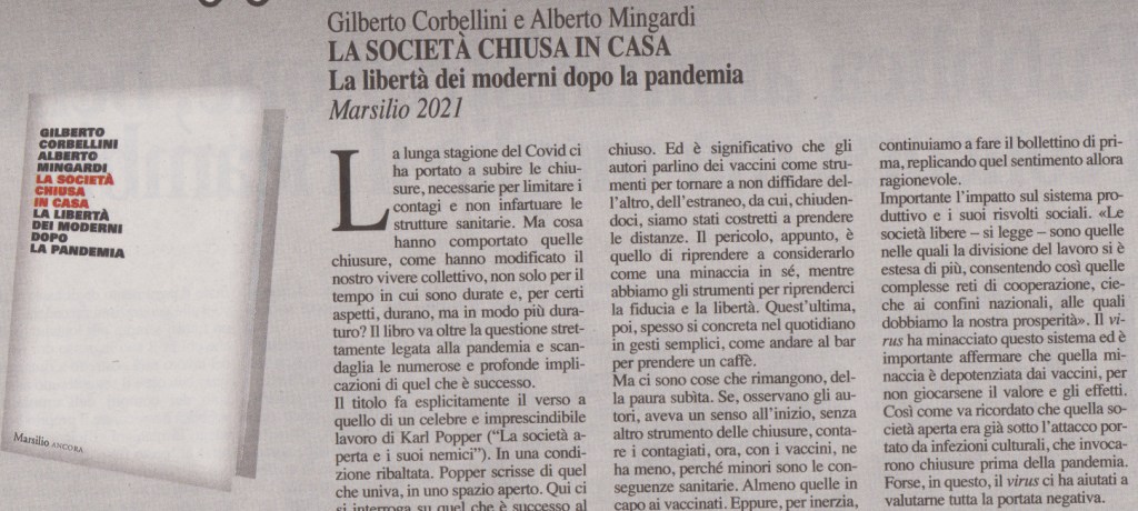 Corbellini Gilberto, Mingardi Alberto, La società chiusa in casa. La libertà dei moderni dopo la pandemia, marsilio, 2021