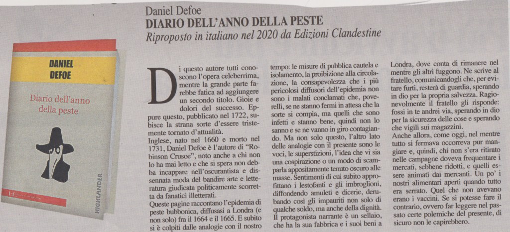 Daniel DEFOE, Diario dell’anno della peste, riproposto nel 2020 da Edizioni clandestine