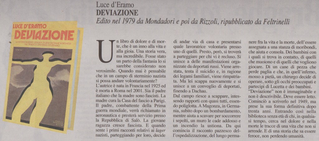 Luce D’Eramo, Deviazione, edito nel 1979 da Mondadori e poi da Rizzoli. Ripubblicato da Feltrinelli