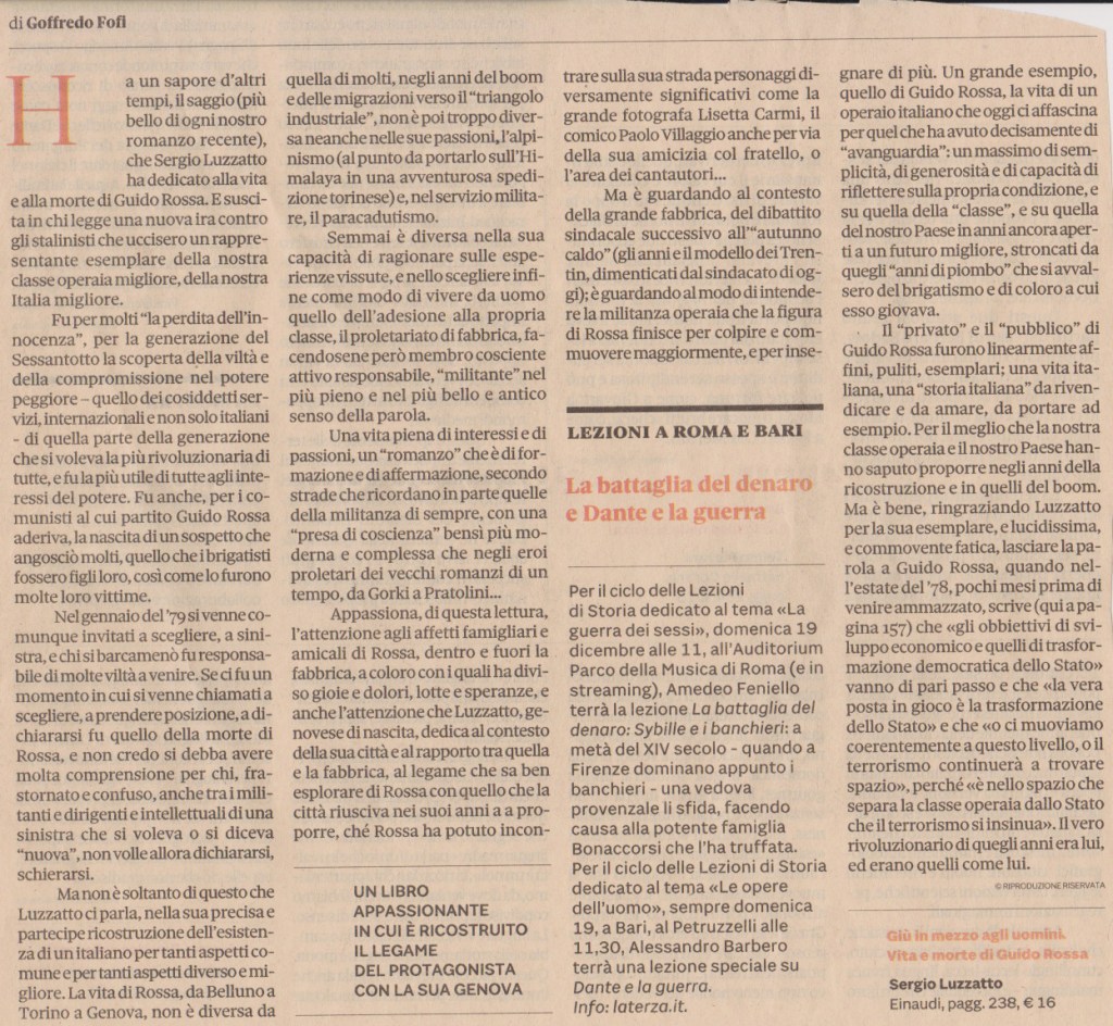 Senza voler nulla togliere al merito politico e civile del sacrificio di Rossa, Sergio Luzzatto si è accostato alla sua figura con altre intenzioni. Oltre l’immaginetta, ha voluto scoprire l’uomo. Autorizzato ad accedere (il primo a poterlo fare) all’archivio di famiglia, ha voluto guardare alla vita di Rossa, almeno altrettanto che alla sua morte. Si è trovato cosí a fare i conti con una personalità originale, irrequieta, scomoda: quanto di piú lontano, sia in fabbrica sia fuori, dall’icona dell’operaio comunista come militante disciplinato.