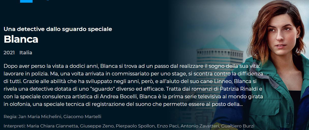 Tratta dai romanzi di Patrizia Rinaldi e con la speciale consulenza artistica di Andrea Bocelli, Blanca è la prima serie televisiva al mondo girata in olofonia, una speciale tecnica di registrazione del suono che permette essere al posto della protagonista.