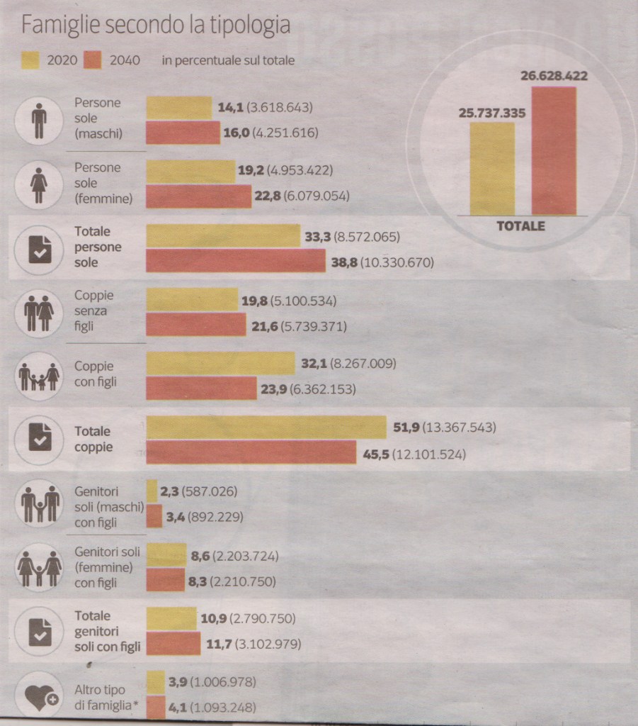 Famiglie italiane per numero dei componenti, proiezioni 2020/2040