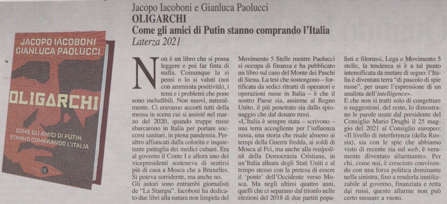 Jacopo Iacoboni, Gianluca Paolucci, Oligarchi. Come gli amici di putin stanno comprando l’Italia, Laterza, 2021. (il minuscolo è dovuto e voluto, stavo scrivendo “sputin”)