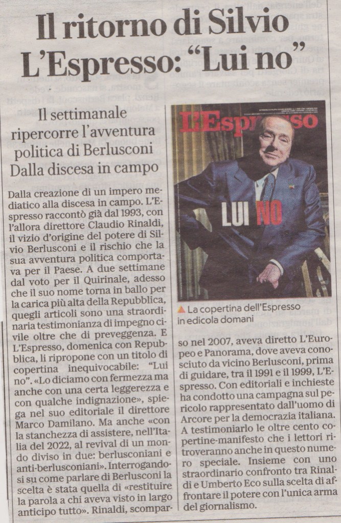 berlusconi, LUI NO, articoli di Claudio Rinaldi (1946-2007) in l’Espresso del 9 gen 2021
