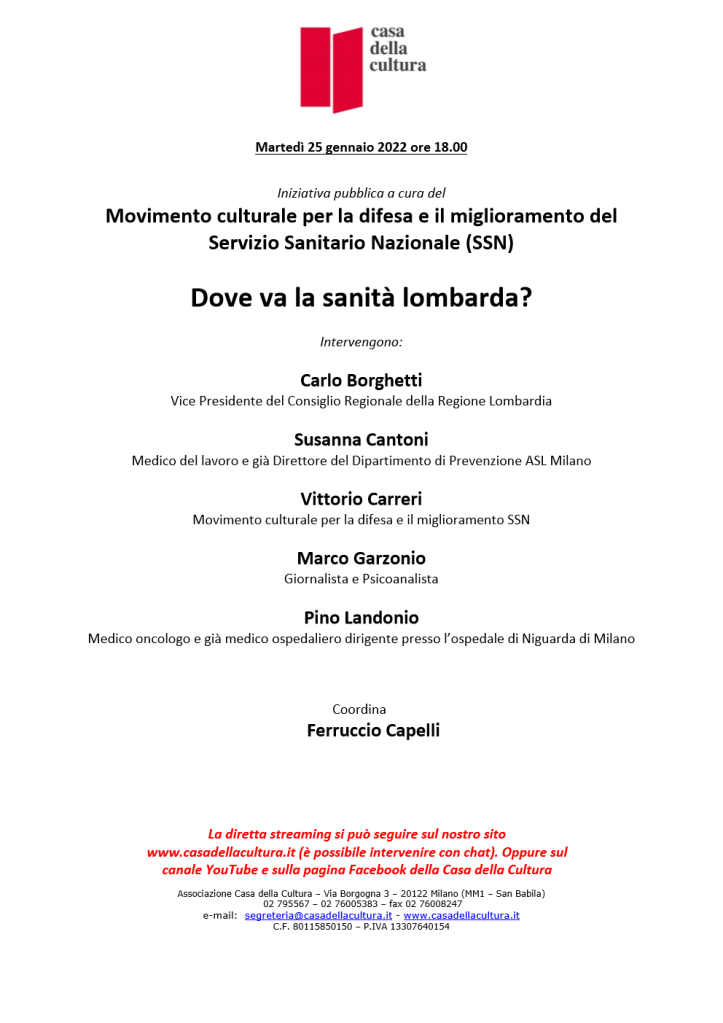 Dove va la sanità lombarda? incontro del Movimento per la difesa e il miglioramento del Servizio Sanitario Nazionale, intervento di VITTORIO CARRERI, Casa della Cultura, Milano, 25 gennaio 2022
