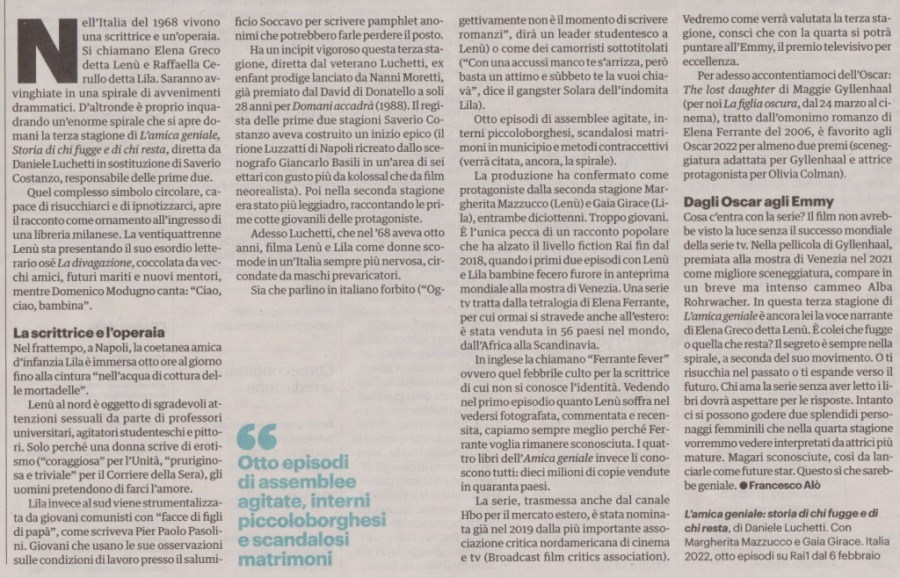 L’AMICA GENIALE: storia di chi fugge e di chi resta, terza stagione della serie televisiva, Rai1, 8 puntate, febbraio 2022
