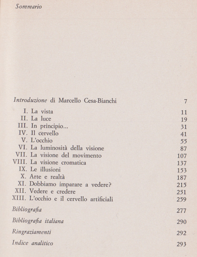 R. L. GREGORY, introduzione di Marcello Cesa-Bianchi, OCCHIO e CERVELLO. La psicologia del vedere, Il Saggiatore, 1979. Indice del libro