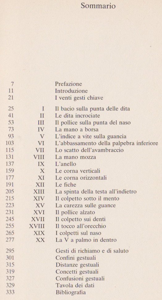 Desmond MORRIS, P. Collet, P. Marsh, M.O’Shaughnessy, I GESTI, origini e diffusione, Mondadori, 1979. Indice del libro