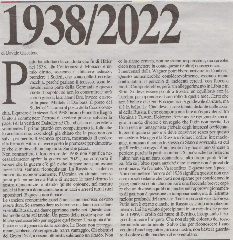 (s) putin ha adottato la condotta che fu di hitler nel 1938 …, di Davide Giacalone in La Ragione, 23 feb 22