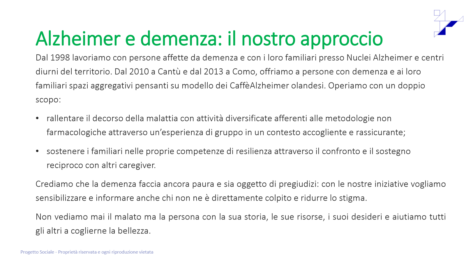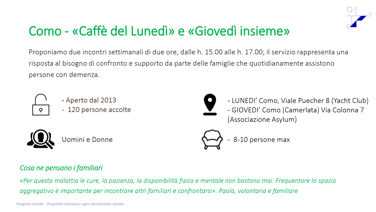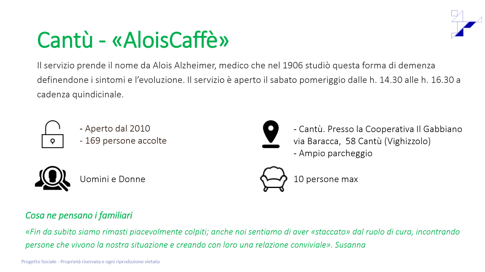 il nostro servizio “AloisCaffè – spazio aggregativo per persone con demenza e loro familiari” sarà aperto nel mese di marzo sabato 12 e sabato 26 marzo sempre dalle h. 14.30 alle h. 16.30, in via Baracca, 58 presso i locali della Cooperativa “Il Gabbiano” di Cantù – frazione di Vighizzolo.