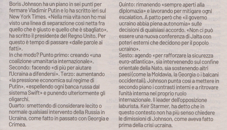 Regno Unito: Il piano in 6 punti di Boris Johnson per fermare vladimir (s) putin, in Corriere della Sera, 8.3.22