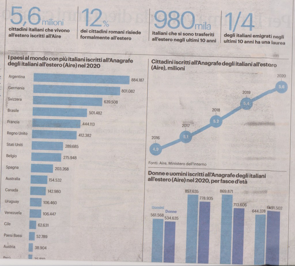 Il Paese con più italiani è la Argentina (648.333) seguito da Germania (631.243) e Svizzera (520.713).