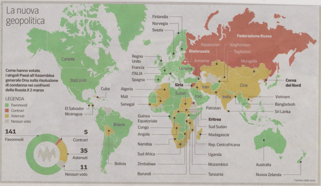 Geopolitica: come hanno votato i singoli paesi all’Assemblea generale ONU sulla risoluzione di condanna della guerra di invasione della russia, marzo 2022