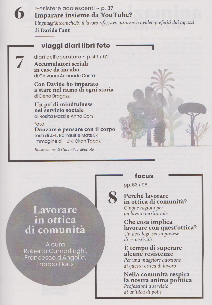 ♦ Accumulatori seriali in case da incubo di Giovanni Armando Costa ♦ Con Davide ho imparato a stare nel ritmo di ogni storia di Elena Bragazzi ♦ Un po’ di mindfulness nel servizio sociale, di Rosita Mazzi e Anna Corsi ♦ Danzare è pensare con il corpo testi di J.-L. Barrault e Mats Ek, immagine di Hulki Okan Tabak