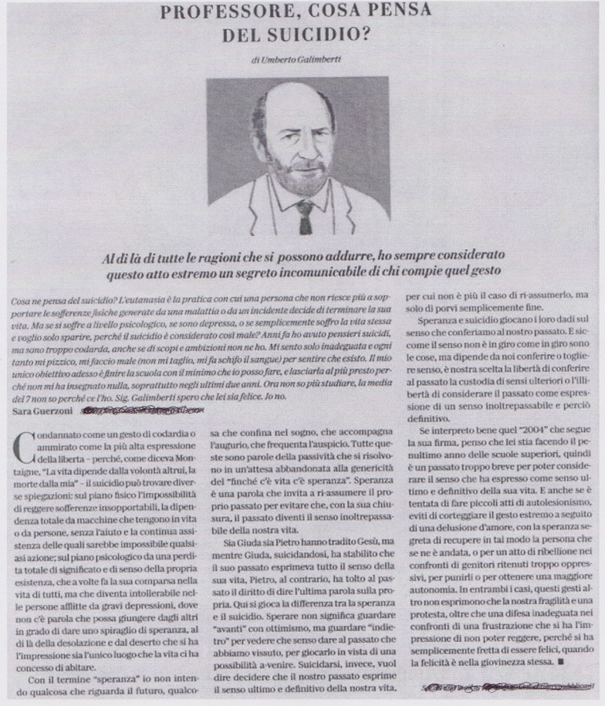 suicidio: “al di là di tutte le ragioni che si possono addurre, ho sempre considerato questo atto estremo un segreto incomunicabile di chi compie quel gesto”, Umberto Galimberti in D La Repubblica 19.3.22