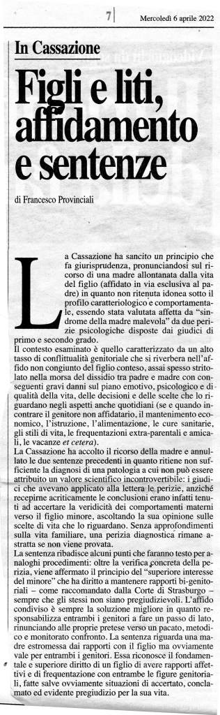 la Cassazione sancisce il principio dell’AFFIDAMENTO CONDIVISO, articolo in La Ragione, 6 apr 22