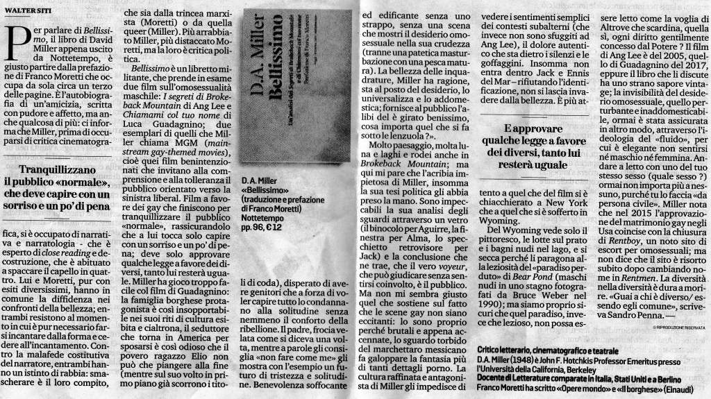 Attraverso un’analisi per nulla conciliante dei Segreti di Brokeback Mountain di Ang Lee e di Chiamami col tuo nome di Luca Guadagnino, Miller mostra come questi film siano, in definitiva e nonostante l’apparente scabrosità e sincerità del tema toccato, comfort movies in cui la “differenza” omosessuale è abilmente disinnescata sotto la “finezza”, il “buon gusto” e l’educato “sottovoce” dello sguardo registico.