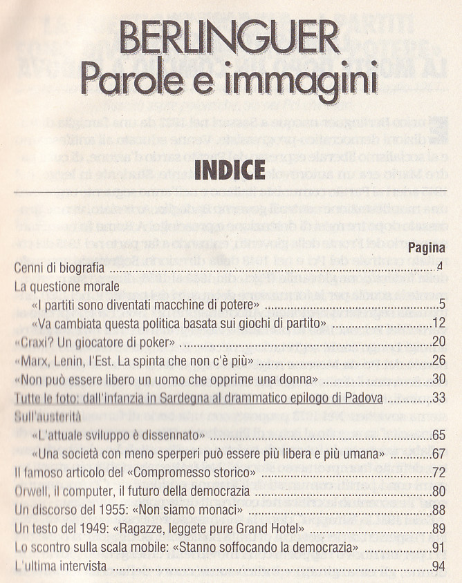Berlinguer. Parole e immagini, Libera Informazione Editrice, supplemento al n. 22 di Avvenimenti, 1994. Indice del libro