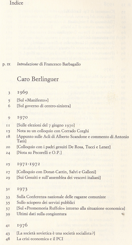 Caro Berlinguer. Note e appunti riservati di Antonio Tatò a Enrico Berlinguer, 1969-1984, Einaudi, 2003. Indice del libro