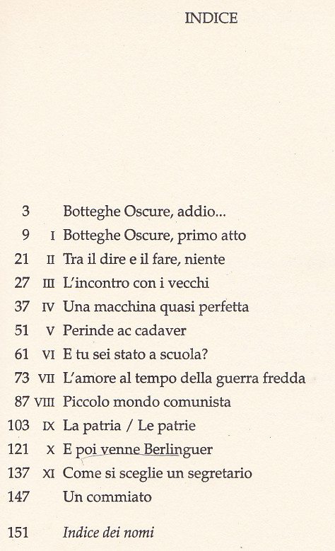 Miriam Mafai, Botteghe oscure, addio. Com’eravamo comunisti, Mondadori, 1996. Indice del libro
