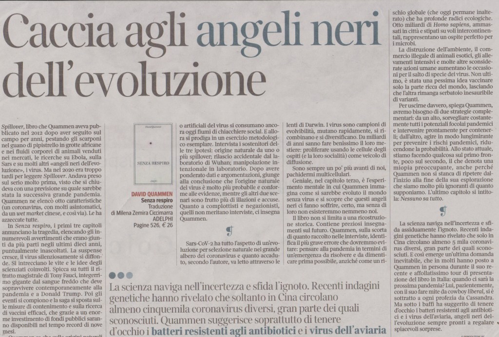 Chi vincerà? Probabilmente si giungerà al pareggio, il che significa che dovremo convivere con il virus in una guerra «a bassa intensità». Ma al di là delle sofferenze inflitte al genere umano dal Sars-CoV-2, Quammen ci ricorda che i virus, come il fuoco, sono un fenomeno non necessariamente negativo, e che può anche portare vantaggi. Non diversamente dai batteri, fanno parte di noi: sono «gli angeli neri dell’evoluzione», meravigliosi e terribili, e questo li rende meritevoli di essere compresi, più che temuti e aborriti.