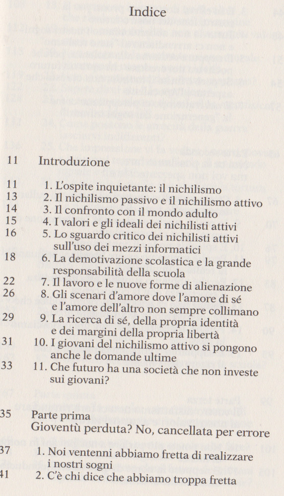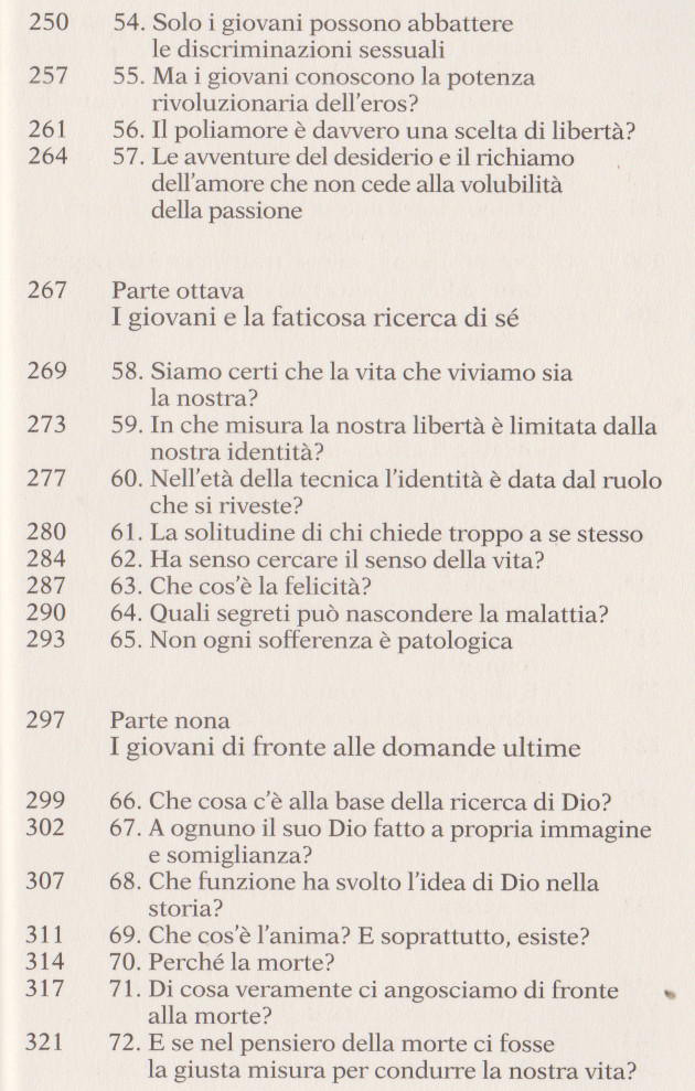 Galimberti Umberto, La parola ai giovani, La Repubblica, 2022. Indice del libro