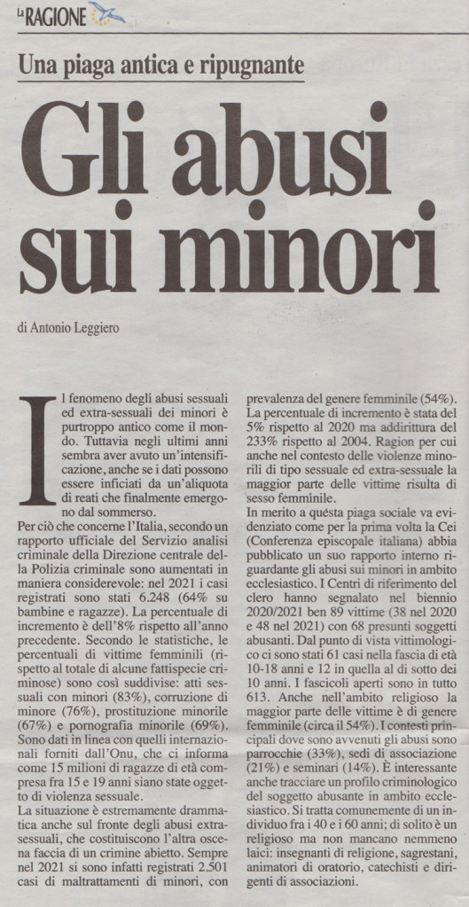 Gli abusi sui minori, una piaga antica e ripugnante. Dati statistici della Polizia criminale al 2021, di Antonio Leggiero in La Ragione 29 novembre 2022