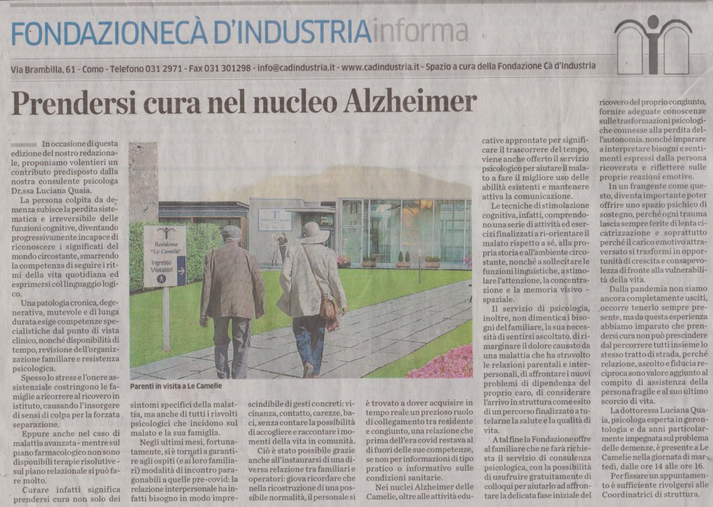 Fondazione Cà d’Industria informa: Prendersi cura nel nucleo Alzheimer, articolo di Luciana Quaia in La Provincia, 18 gennaio 2023