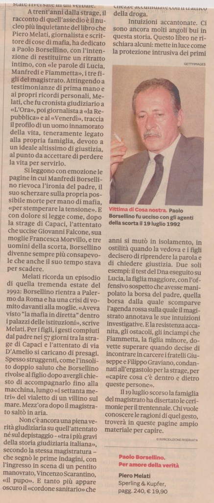 Trent’anni in cerca della verità. Trent’anni nel nome di un’idea di giustizia da rivendicare con fermezza. Queste parole potrebbero riassumere la battaglia portata avanti dalla moglie di Paolo Borsellino, Agnese, e dai figli Lucia, Manfredi e Fiammetta per fare luce su uno degli avvenimenti più bui della nostra storia recente. Dopo la strage di via D’Amelio, infatti, al dolore per la perdita del grande magistrato e della sua scorta si è aggiunto l’ignobile capitolo del depistaggio nelle indagini sugli esecutori materiali del crimine, al quale ha fatto seguito un iter processuale lungo e tortuoso. Anni di lacune e omissioni, bugie e negligenze. Eppure, i figli di Paolo Borsellino hanno affrontato questo difficile percorso con dignità e determinazione, rimanendo spesso lontani dai riflettori e prendendo le distanze dalle celebrazioni che si sono succedute nel corso dei decenni. Lo hanno fatto con sobrietà e rispetto delle istituzioni, fedeli ai princìpi e agli insegnamenti appresi da un uomo, e da un padre, che ha dedicato la sua vita alla lotta alla mafia. In queste pagine c’è la storia di una famiglia e del suo impegno per l’affermazione del «diritto alla verità», ma c’è anche un ritratto corale del giudice che Piero Melati tratteggia con l’aiuto di molte testimonianze, tra le quali spiccano i contributi inediti di Lucia e Fiammetta Borsellino. Cucendo insieme ricordi e punti di vista diversi, questo libro illumina la figura di Paolo Borsellino da una prospettiva nuova e racconta – attraverso la voce dei protagonisti – «una delle pagine più vergognose e tragiche della storia giudiziaria italiana». E in questo modo ci esorta a raccogliere un’eredità preziosa, a partecipare attivamente alla ricerca della verità e all’affermazione della giustizia. Perché la storia di Paolo Borsellino e della sua famiglia è anche la nostra storia.