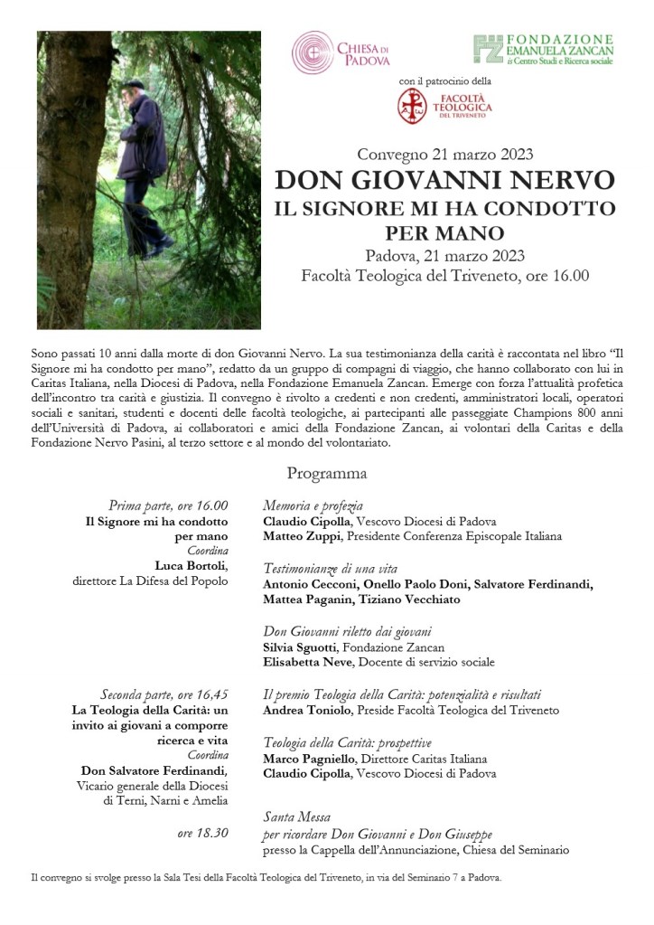 Durante il convegno verrà presentato «Don Giovanni Nervo: Il Signore mi ha condotto per mano», un libro redatto da un gruppo di compagni di viaggio, persone che hanno collaborato con lui in Caritas Italiana, nella Diocesi di Padova, nella Fondazione Emanuela Zancan.
