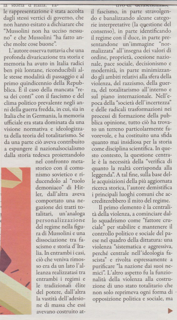 Il volume si propone di rispondere a questa visione nostalgica. Smantella, pezzo per pezzo, l’immagine di un fascismo lungimirante ed efficiente. Analizza non solo le violenze del regime fascista, ma anche le scelte politiche e sociali che caratterizzarono il Ventennio e che portarono l’Italia al disastro della Seconda guerra mondiale. Dimostra, infine, quanto sia stato costoso per l’Italia l’affidamento del potere a un uomo solo: Mussolini.