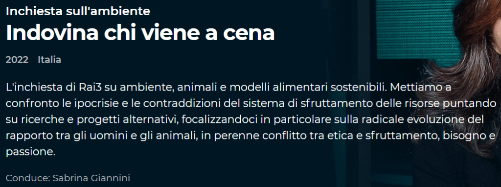 L’inchiesta di Rai3 su ambiente, animali e modelli alimentari sostenibili. Mettiamo a confronto le ipocrisie e le contraddizioni del sistema di sfruttamento delle risorse puntando su ricerche e progetti alternativi, focalizzandoci in particolare sulla radicale evoluzione del rapporto tra gli uomini e gli animali, in perenne conflitto tra etica e sfruttamento, bisogno e passione.