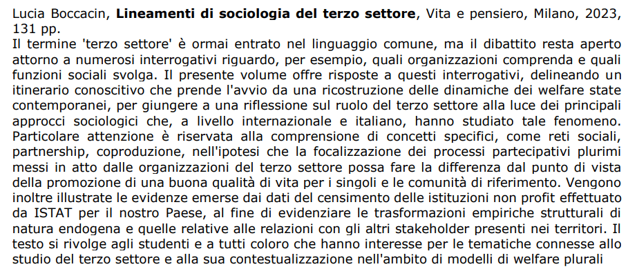 Il termine ‘terzo settore’ è ormai entrato nel linguaggio comune, ma il dibattito resta aperto attorno a numerosi interrogativi. Quali organizzazioni comprende? Quali funzioni sociali svolge? Come sono sostenute e rinforzate le motivazioni dei suoi aderenti? Quali azioni, interventi e processi di cura sono realizzati dalle sue diverse componenti per il benessere delle persone e delle comunità? Quali relazioni attiva con i soggetti pubblici e privati presenti nei contesti locali? Il presente volume intende offrire risposte a questi interrogativi, delineando un itinerario conoscitivo che prende l’avvio da una ricostruzione delle dinamiche dei welfare state contemporanei, per giungere a una riflessione sul ruolo del terzo settore alla luce dei principali approcci sociologici che, a livello internazionale e italiano, hanno studiato tale fenomeno. Particolare attenzione è riservata alla comprensione di concetti specifici, come reti sociali, partnership, coproduzione, nell’ipotesi che la focalizzazione dei processi partecipativi plurimi messi in atto dalle organizzazioni di terzo settore possa fare la differenza dal punto di vista della promozione di una buona qualità di vita per i singoli e le comunità di riferimento. Vengono inoltre illustrate le evidenze emerse dai dati del censimento delle istituzioni non profit effettuato da ISTAT per il nostro Paese, al fine di evidenziare le trasformazioni empiriche strutturali di natura endogena e quelle relative alle relazioni con gli altri stakeholder presenti nei territori. Il testo si rivolge agli studenti e a tutti coloro che hanno interesse per le tematiche connesse allo studio del terzo settore e alla sua contestualizzazione nell’ambito di modelli di welfare plurali.