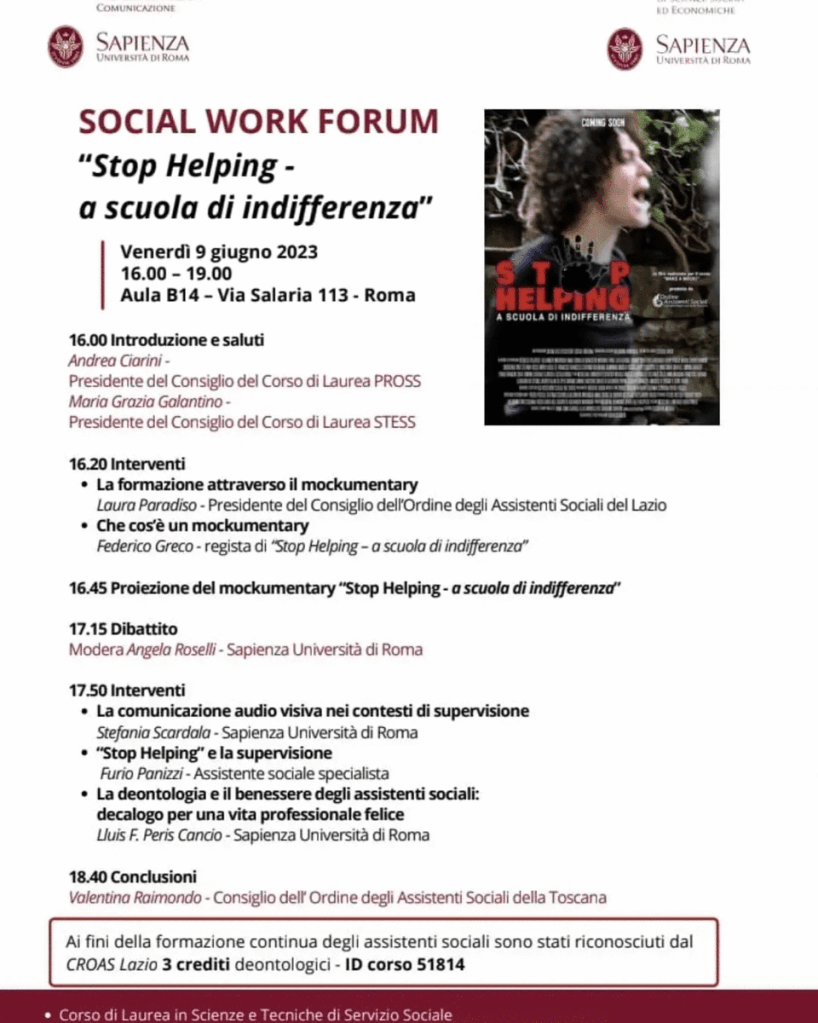 Venerdì 9 giugno 2023, alle ore 16.00, nell’Aula B14 del Dipartimento di Scienze sociali ed economiche in Via Salaria 113, si terrà il seminario Stop Helping – a scuola di indifferenza, secondo appuntamento nell’ambito del ciclo di seminari che il Social Work Forum dedica all’approfondimento di tematiche di rilevanza per la professione di assistente sociale.