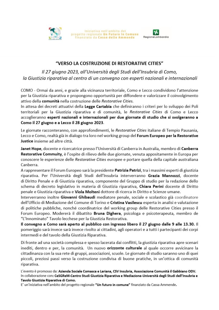“VERSO LA COSTRUZIONE DI RESTORATIVE CITIES”, Martedì 27 giugno, all’Università degli Studi dell’Insubria di Como, la Giustizia riparativa al centro di un convegno con esperti nazionali e internazionali