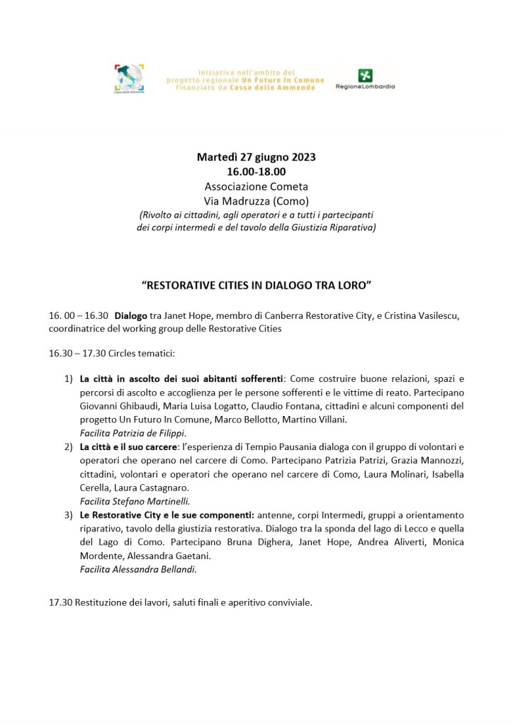 Il giorno successivo, mercoledì 28 giugno, sarà Lecco a proporre un tavolo analogo. Ormai da anni, infatti, Como e Lecco condividono l’attenzione alla Giustizia riparativa e propongono opportunità per diffondere e valorizzare il coinvolgimento attivo della comunità nella costruzione delle Restorative Cities.