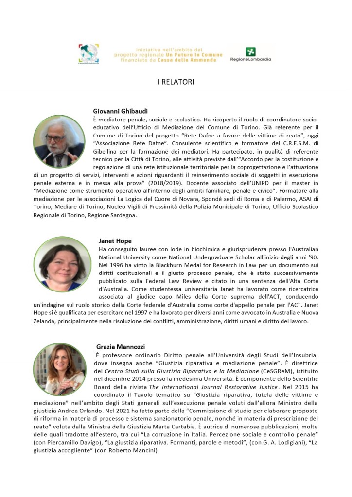 Per l’Università degli Studi dell’Insubria interverrà Grazia Mannozzi docente di Diritto Penale e di Giustizia riparativa, componente del Gruppo di studio per la redazione dello schema di decreto legislativo in materia di Giustizia riparativa.