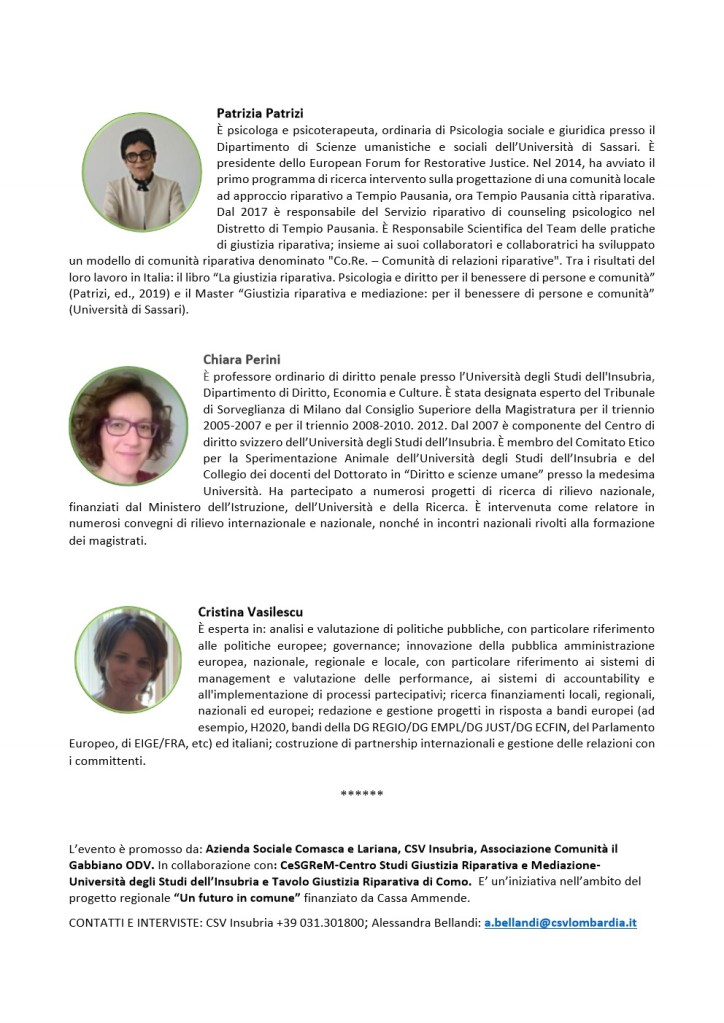 L’evento è promosso da: Azienda Sociale Comasca e Lariana, CSV Insubria, Associazione Comunità il Gabbiano ODV. In collaborazione con: CeSGReM-Centro Studi Giustizia Riparativa e Mediazione-Università degli Studi dell’Insubria e Tavolo Giustizia Riparativa di Como. E’ un’iniziativa nell’ambito del progetto regionale “Un futuro in comune” finanziato da Cassa Ammende.