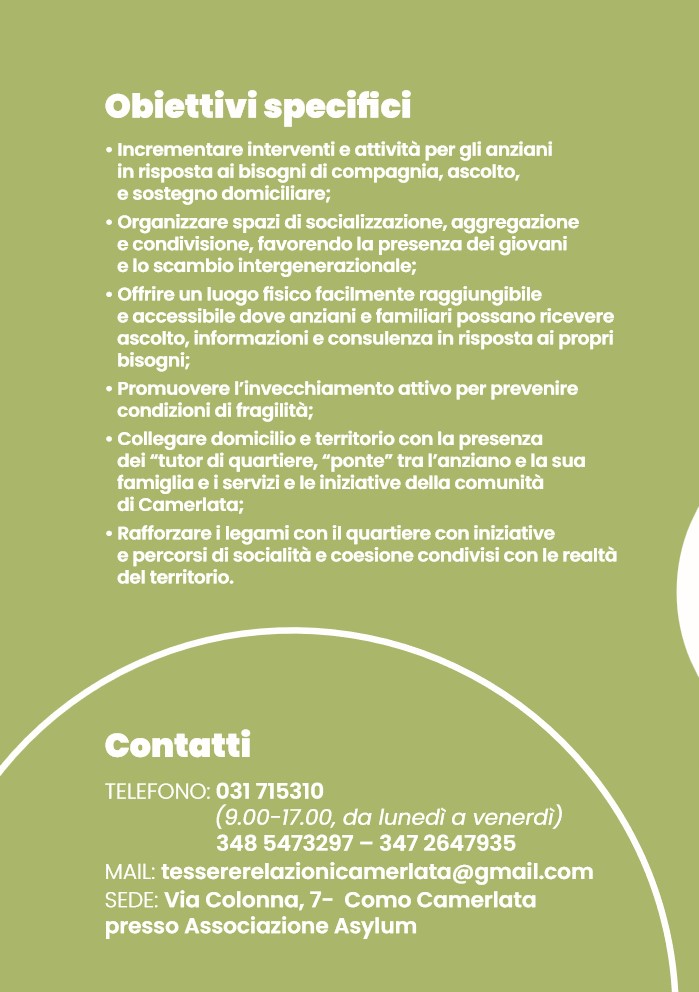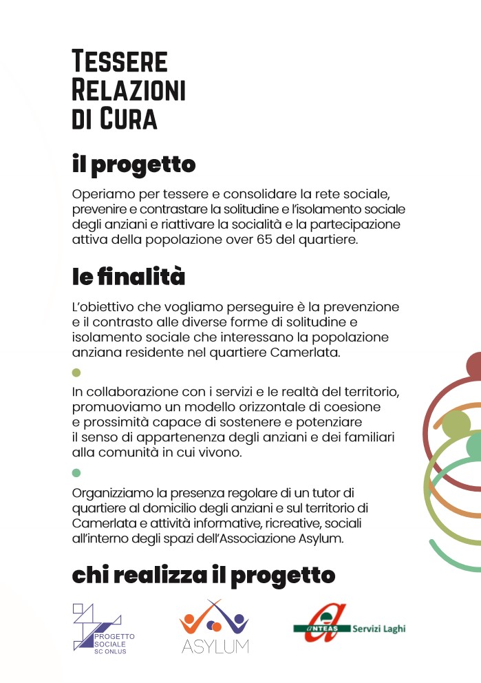 Tessere relazioni di cura, azioni di prevenzione e contrasto alla solitudine degli anziani residenti a Camerlata (provincia di Como) , a cura della Cooperativa Progetto Sociale, Associazione Asylum, Anteas-servizi dei laghi