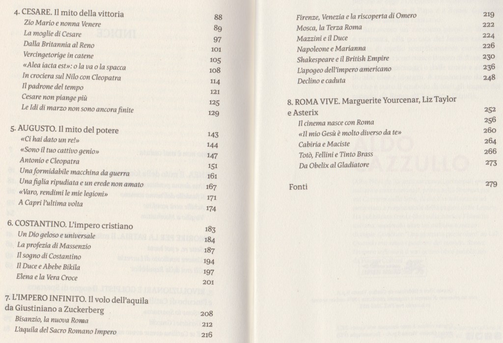 Tutti gli imperi della storia si sono presentati come eredi degli antichi romani: l’Impero romano d’Oriente; il Sacro Romano Impero di Carlo Magno; Mosca, la terza Roma. E poi l’Impero napoleonico e quello britannico. I regimi fascista e nazista. L’impero americano e quello virtuale di Mark Zuckerberg, grande ammiratore di Augusto: il primo uomo a guidare una comunità multietnica di persone che non si conoscevano tra loro ma condividevano lingua, immagini, divinità, cultura. Roma vive. In tutto il mondo le parole della politica vengono dal latino: popolo, re, Senato, Repubblica, pace, legge, giustizia. Kaiser e Zar derivano da Cesare. I romani hanno dato i nomi ai giorni e ai mesi. Hanno ispirato poeti e artisti in ogni tempo, da Dante a Hollywood. Hanno dettato le regole della guerra, dell’architettura, del diritto che vigono ancora oggi. Hanno affrontato questioni che sono le stesse della nostra quotidianità, il razzismo e l’integrazione, la schiavitù e la cittadinanza: si poteva diventare romani senza badare al colore della pelle, al dio che si pregava, al posto da cui si veniva. A noi italiani in particolare i romani hanno dato le strade, la lingua, lo stile, l’orgoglio, e il primo embrione di nazione.