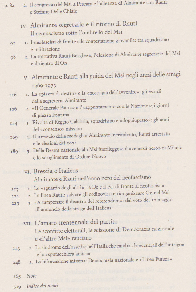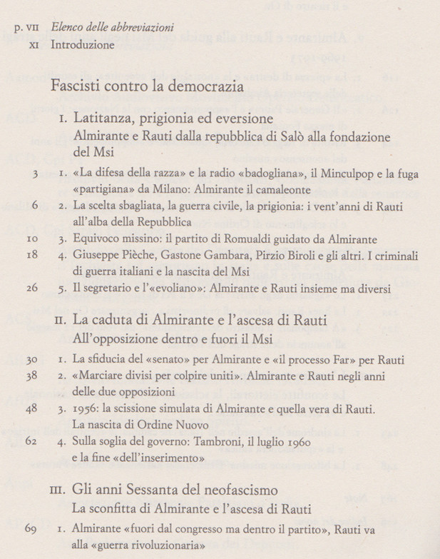 Giorgio Almirante e Giuseppe (Pino) Rauti rappresentarono il nostalgismo dei reduci di Salò nel dopoguerra e sostanziarono quel neofascismo politico che nei decisivi anni Sessanta e Settanta fu radicalmente ostile ai profondi mutamenti che attraversavano il Paese.