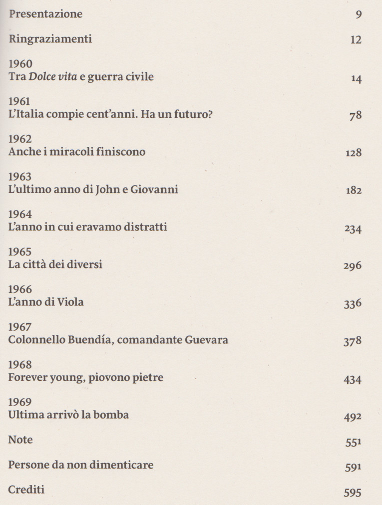 La stragrande maggioranza degli italiani di oggi è nata dopo la guerra, tutti dunque, direttamente o dai racconti di chi c’era, sappiamo qualcosa di quel “decennio favoloso” che ci ha visto camminare insieme a Fellini, Visconti, Togliatti e Moro, Mina, Monica Vitti, Claudia Cardinale, Rita Pavone, Catherine Spaak; correre insieme ad Abebe Bikila e Gigi Riva, leggere insieme a Italo Calvino, Leonardo Sciascia, Natalia Ginzburg e Gabriel García Márquez.