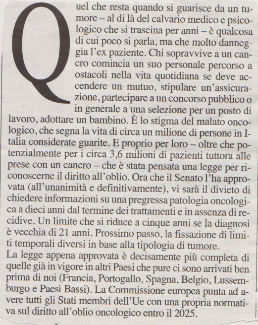 Il 5 dicembre 2023 il Senato, all’unanimità, ha dato il definitivo via libera al progetto di legge sul diritto all’oblio dell’ex paziente oncologico, il quale è destinato, quindi, a divenire presto legge con la promulgazione del Presidente della Repubblica
