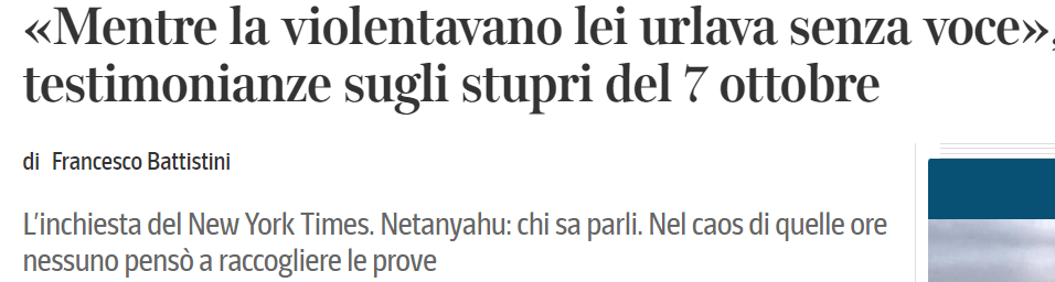 Anche ilNew York Times s’è messo al lavoro: due mesi d’inchiesta approfondita a otto mani guidata da un premio Pulitzer, Jeffrey Gettleman, 150 interviste, racconti che lasciano senza fiato. Ne esce una galleria degli orrori, vestiti strappati, gambe divaricate, genitali mutilati. E non casi sporadici, ma un sistema organizzato di violenza su chi era ebrea e per di più donna. Analizzando video, foto, dati gps, telefonate, il giornale americano ha scoperto almeno trenta episodi.