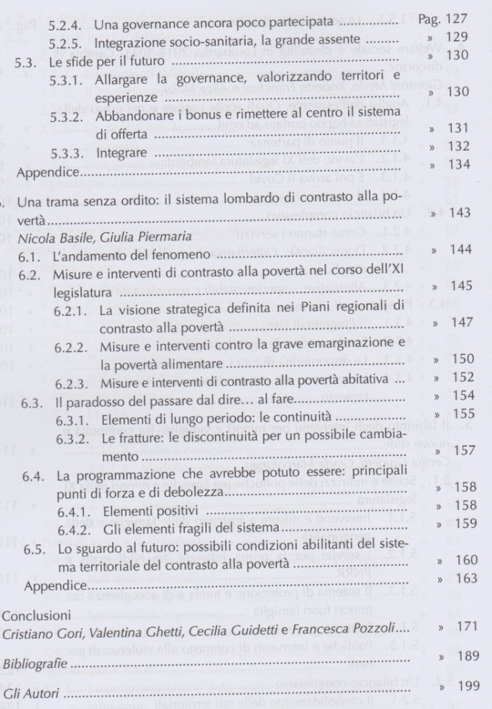 Dopo aver delineato lo scenario d’insieme delle politiche regionali di welfare sociale, il volume propone un‘analisi delle trasformazioni che hanno investito il sistema di programmazione e governance regionale e dell’evoluzione del finanziamento e della spesa dedicata al welfare lombardo, guardando prima all’investimento complessivo di risorse e poi alla sua