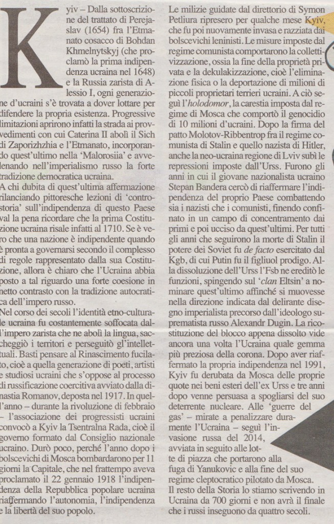 La lunga storia della INDIPENDENZA UCRAINA, articolo di Giorgio Provinciali, in la Ragione 20 gennaio 2024